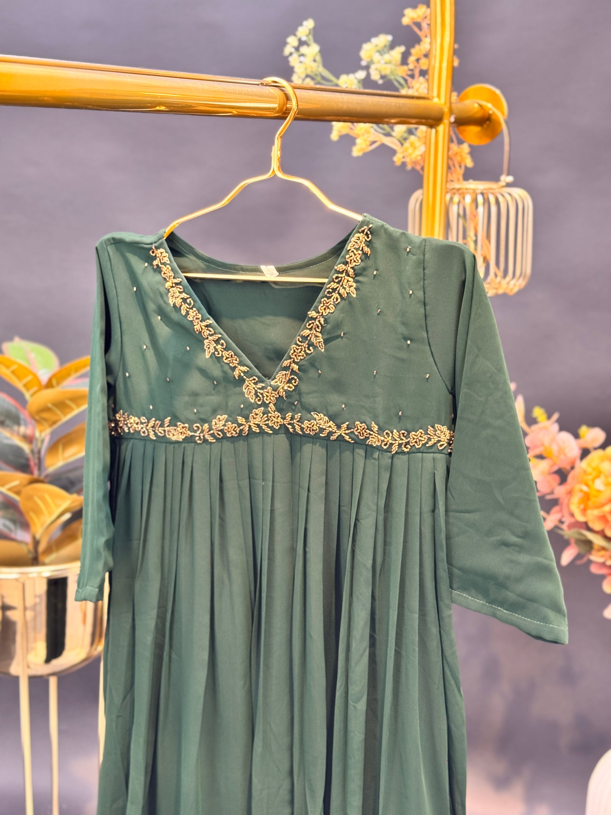 Embroidered Empire-Cut Georgette Anarkali Kurti - Bottle Green